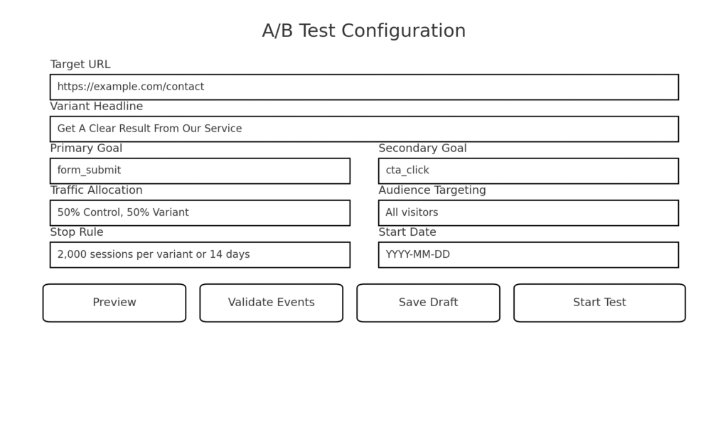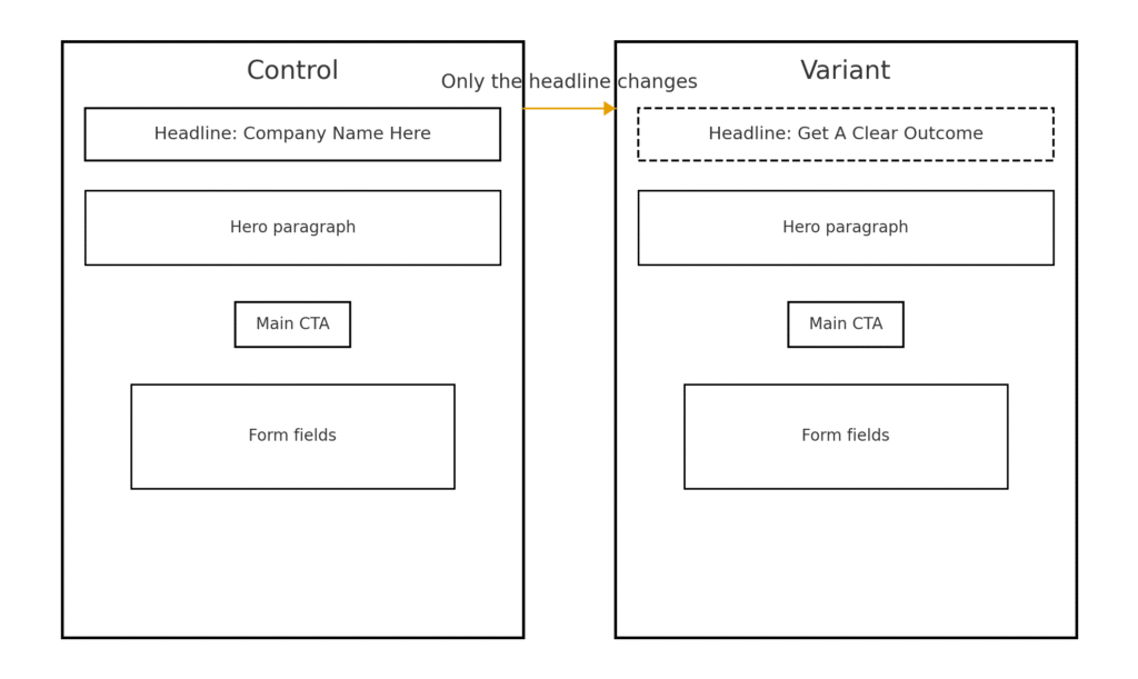 Your control is the current page. Your variant is the same page with one meaningful change. Leave the hero image, button label, and form fields unchanged unless they are the single element you are testing. One change keeps results believable and avoids debates about which edit caused the effect.