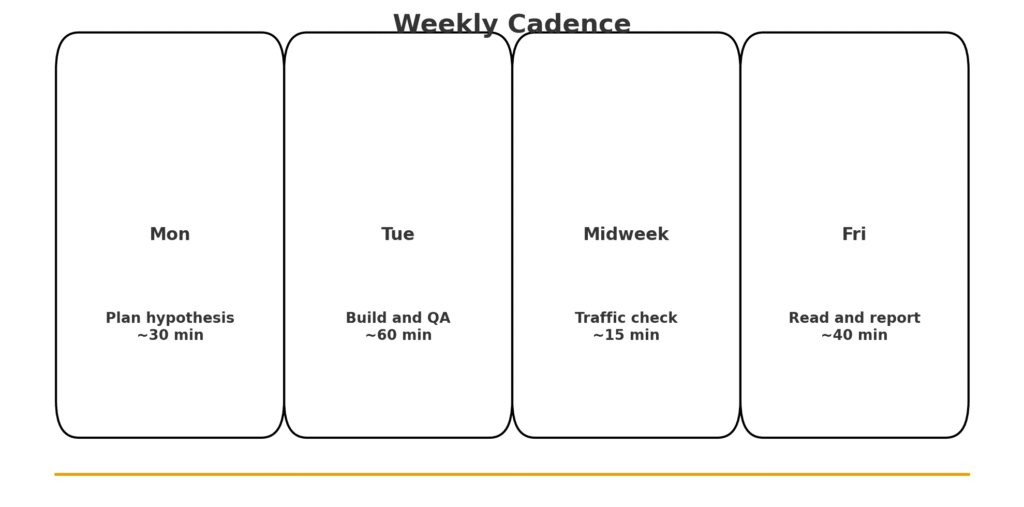 Give your week a shape you can stick to. On Monday, set one hypothesis and confirm the sample size and the stop rule, about 30 minutes total. Tuesday is for building the single variant and verifying tracking, roughly 60 minutes. Midweek, take around 15 minutes to check traffic quality and ensure clean event collection. By Friday, spend about 40 minutes reading the result, capturing one screenshot, writing a one-line lesson, and choosing the next move. If the traffic mix shifts mid-test, for example, a one-day promo spike, extend the run to reach your session target with typical traffic.