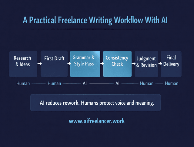 Most advice about writing with AI stays vague. In freelance work, the value comes from using AI in specific spots where it reduces rework and protects consistency.